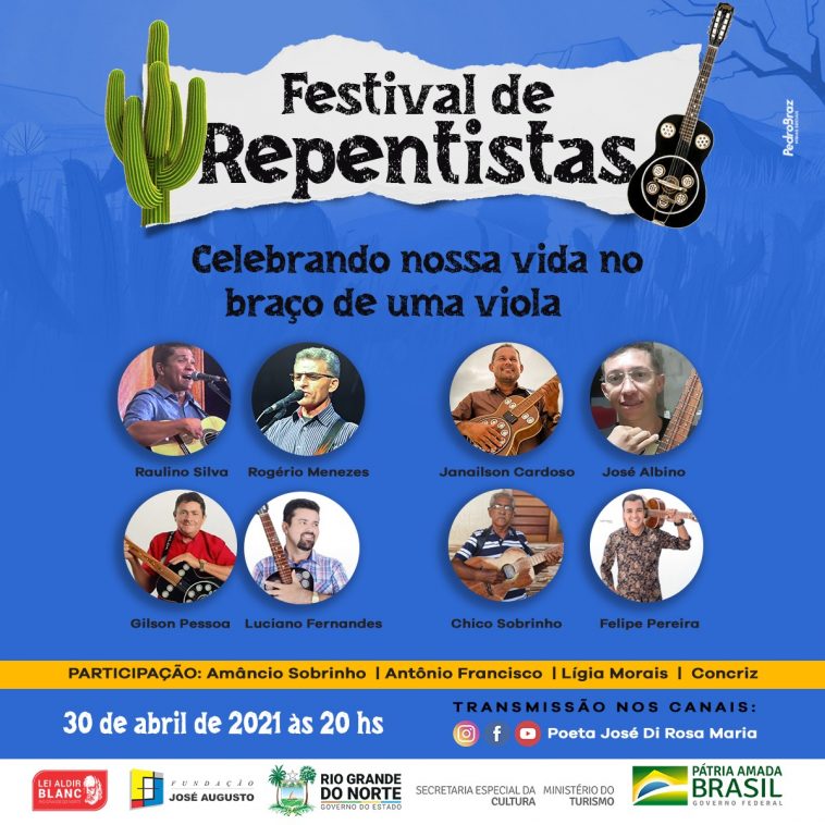 O Festival de Repentistas Online “Celebrando a vida no braço de uma viola” é um projeto contemplado pela lei Aldir Blanc e será transmitido ao vivo às 20h do dia 30 de abril pelo Facebook