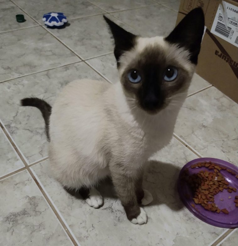 Afora os olhos azuis e o porte longilíneo, ela possui a maior parte do pelo na cor café com leite, um marrom clarinho. A cauda, as partes superiores das patas, as orelhas, o focinho e o centro do rosto são negros. Após uma busca na internet, informei-me de que, com a chegada da idade adulta, as regiões mais claras da pelagem tendem a mudar para um marrom azulado ou um castanho-escuro, sem desvirtuamento da raça. Segundo um amigo veterinário — e isto é inequívoco —, Pepita é uma gatinha siamesa com cerca de três a quatro meses de nascida.