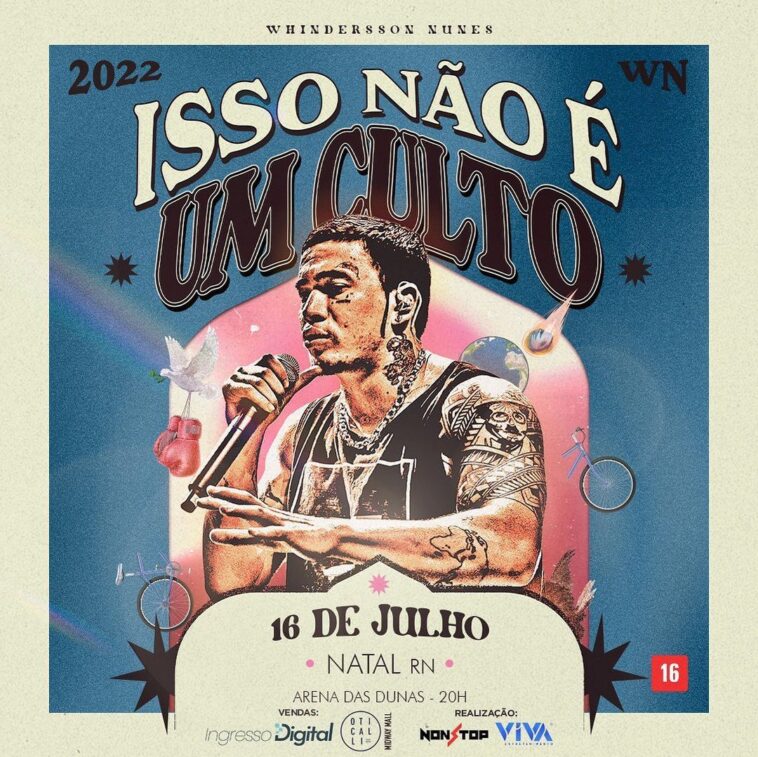 Dia 16 de julho Whindersson Nunes apresentará o show da sua turnê de despedida dos palcos, em Natal, a partir das 20h, na Arena das Dunas. A capital potiguar será a quarta do Nordeste a receber a turnê chamada de “Isso não é um culto”. Whindersson se apresentará também em João Pessoa, Recife e Salvador. Além disso, ele já realizou shows pela Europa, que renderam cenas inusitadas.