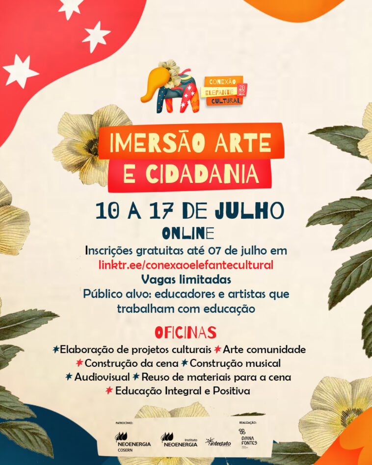 O Conexão Elefante Cultural está com inscrições abertas para a imersão online Arte e Cidadania, voltada para artistas e educadores que trabalham com arte. A ação acontece de 10 a 17 de julho e faz parte das atividades previstas na 7ª edição do projeto, que irá fomentar o cenário artístico de 8 municípios do Rio Grande do Norte.