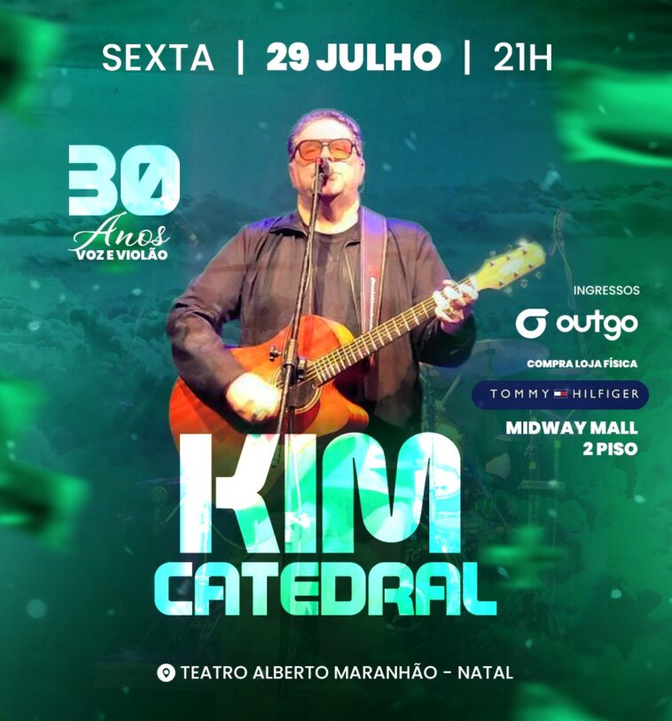 Kim, cantor da Banda Catedral, vem a Natal com sua mais nova turnê Kim – 30 anos de voz e violão. O show traz o estilo Pop Romântico de Kim, marcado por letras apaixonantes, cheio de romantismo e carisma. Ousadia e talento representam a singularidade dessa turnê! A apresentação será no dia 29 de julho, no Teatro Alberto Maranhão.