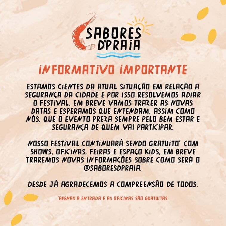 Nosso festival continuará sendo gratuito* com shows, oficinas, feiras e espaço kids, em breve traremos novas informações sobre como será o @saboresdpraia. Desde já agradecemos a compreensão de todos.”