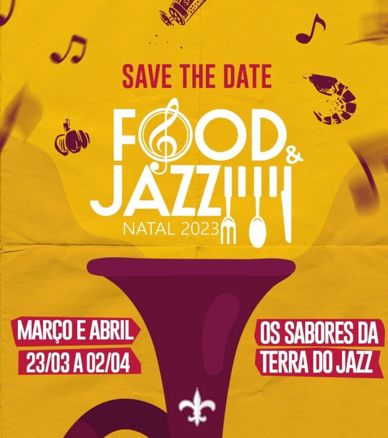 Idealizado por Juçara Figueiredo Produções, a mesma criadora do Fest Bossa & Jazz e do festival gastronômico Sabores da Pipa, o Food & Jazz Natal abre os festivais gastronômicos de 2023 no RN, e acontece sob a coordenação do chef Marcelo Labre, com uma gama de estabelecimentos participantes, entre eles: Old Five, Le Paradis du Café, Restaurante Mipibu, A Casa de Minas, Wesley’s Bar, Meu Barraco Boteco Bistrô, Babalu Cozinha, Páprika Pizzaria e Restaurante, Piazzale Itália, Ô Fuxico Bar, Praiou Ponta Negra, Severina Gastrobar, Espaço Ávalon & Taverna Pub, Empório 52 Confeitaria Afetiva e Criativa, Pousada e Restaurante Genipabu Praia, Estação do Malte, Adocee Doceria, Bistrô Platter For You, Mormaço, Bem Eu Confeitaria, Calígula Pizzaria e Ristorante, Effó Restaurante, Restaurante Navarro, Just Food&Coffee.