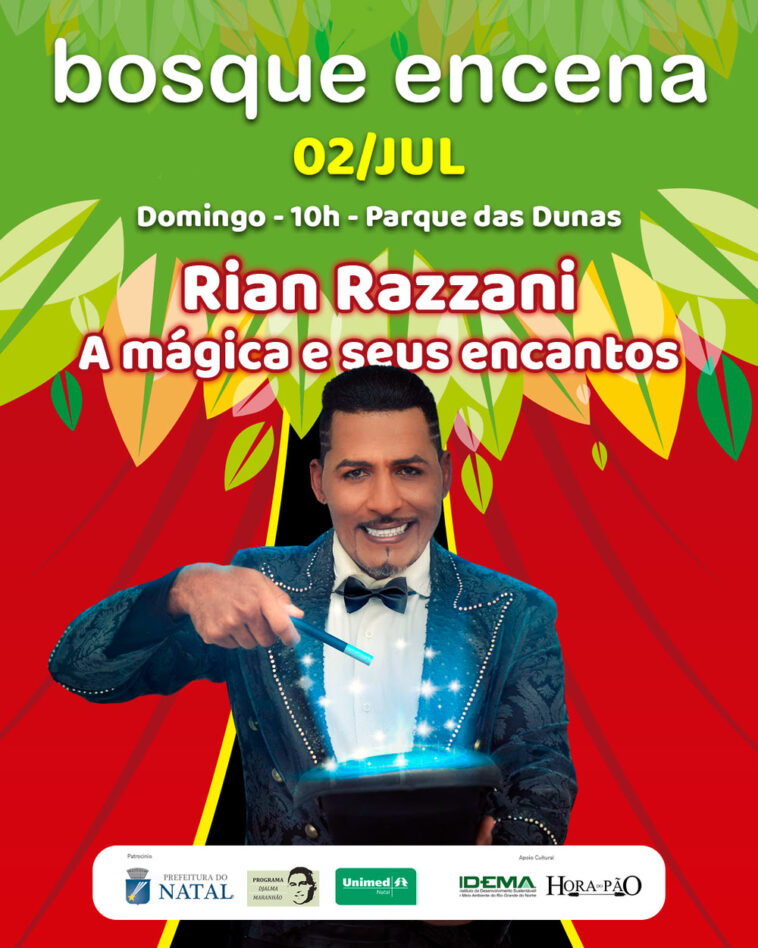 O Bosque Encena da próxima manhã de domingo (02) recebe o Ilusionista RIAN RAZZANI, que apresenta o espetáculo “A MÁGICA E SEUS ENCANTOS” no qual inclui números de habilidades e grandes ilusões.