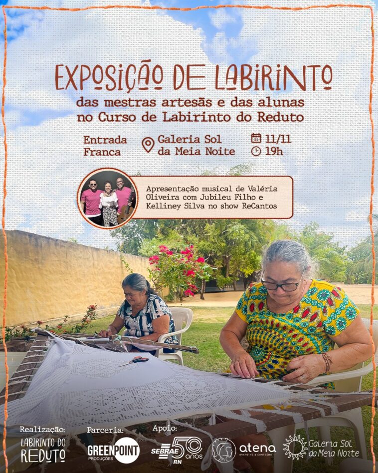 Neste sábado, 11 de novembro, o projeto realizará, na Galeria Sol da Meia Noite, em São Miguel do Gostoso, a exposição das mestras artesãs: Francisca Soares; Maria Salete de Menezes; Luiza Ribeiro de Menezes; Robéria Menezes de Lima; Maria Eulália Menezes da Silva; Maria de Fátima e Maria Gorete Miranda da Silva; como também o trabalho das alunas do curso Labirinto do Reduto coordenado por Robéria Menezes, aprovado no Edital de Economia Criativa do SEBRAE.